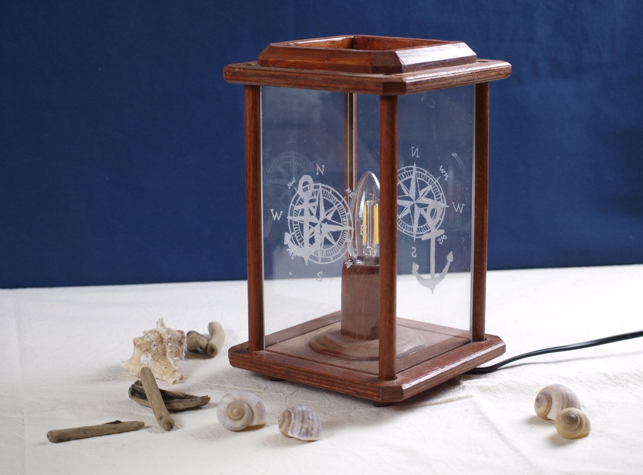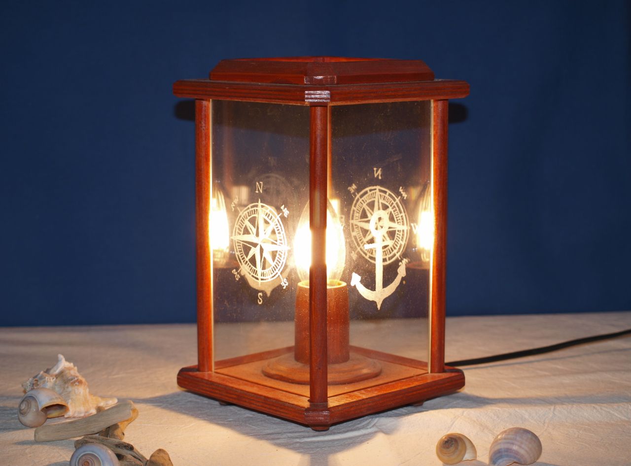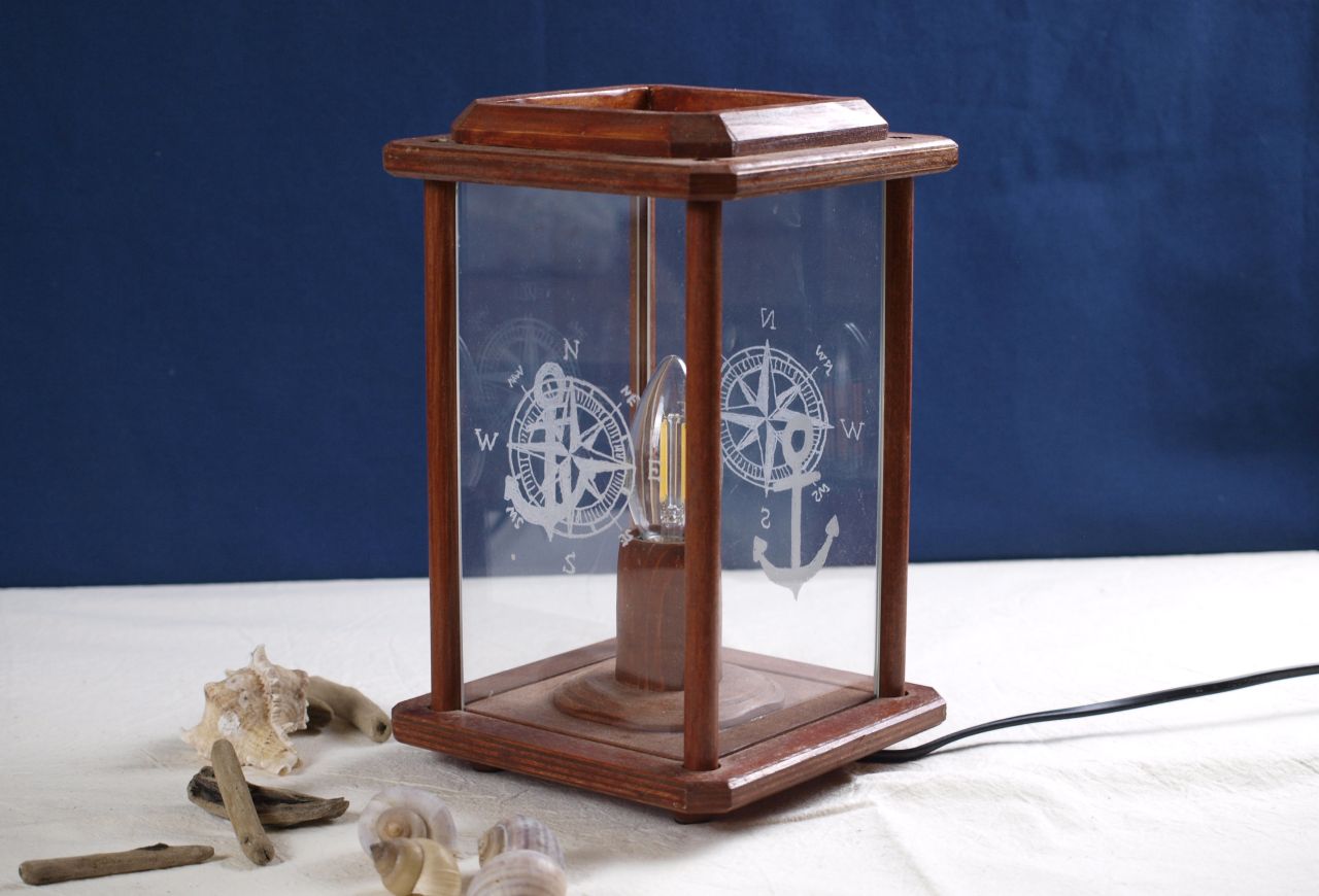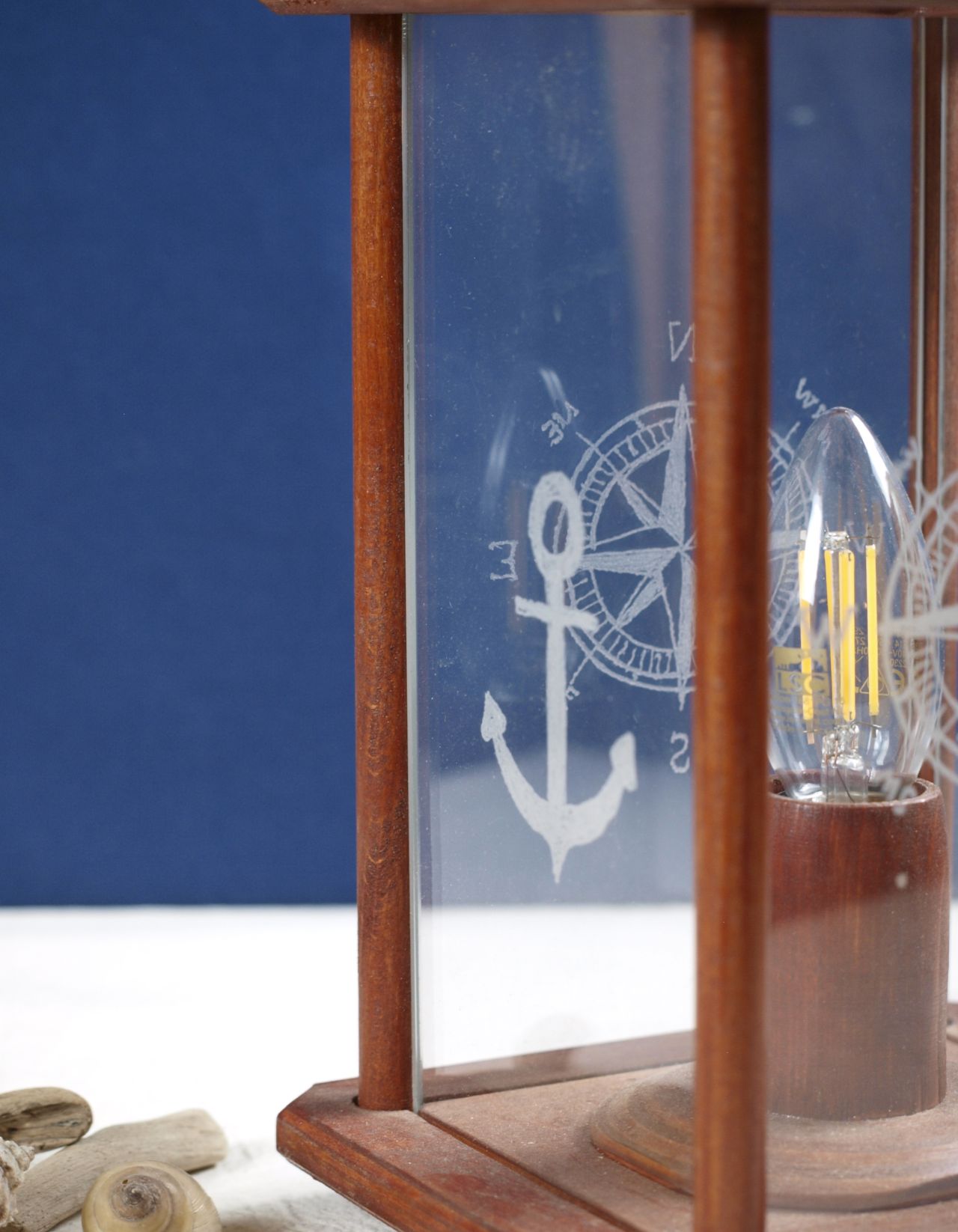 Dekolampe, elektrisch, magahoni mit maritimer Gravur Kompass & Anker