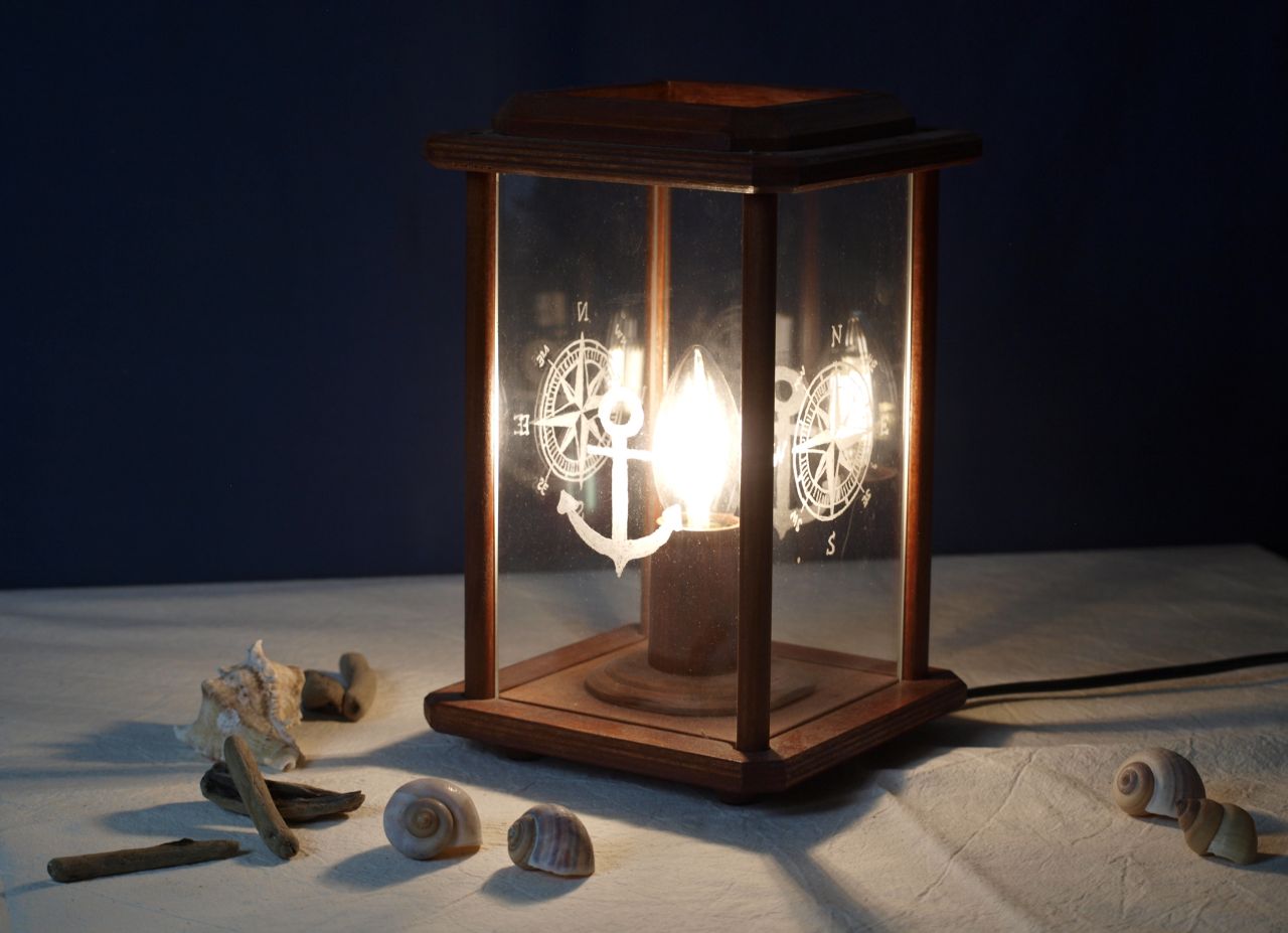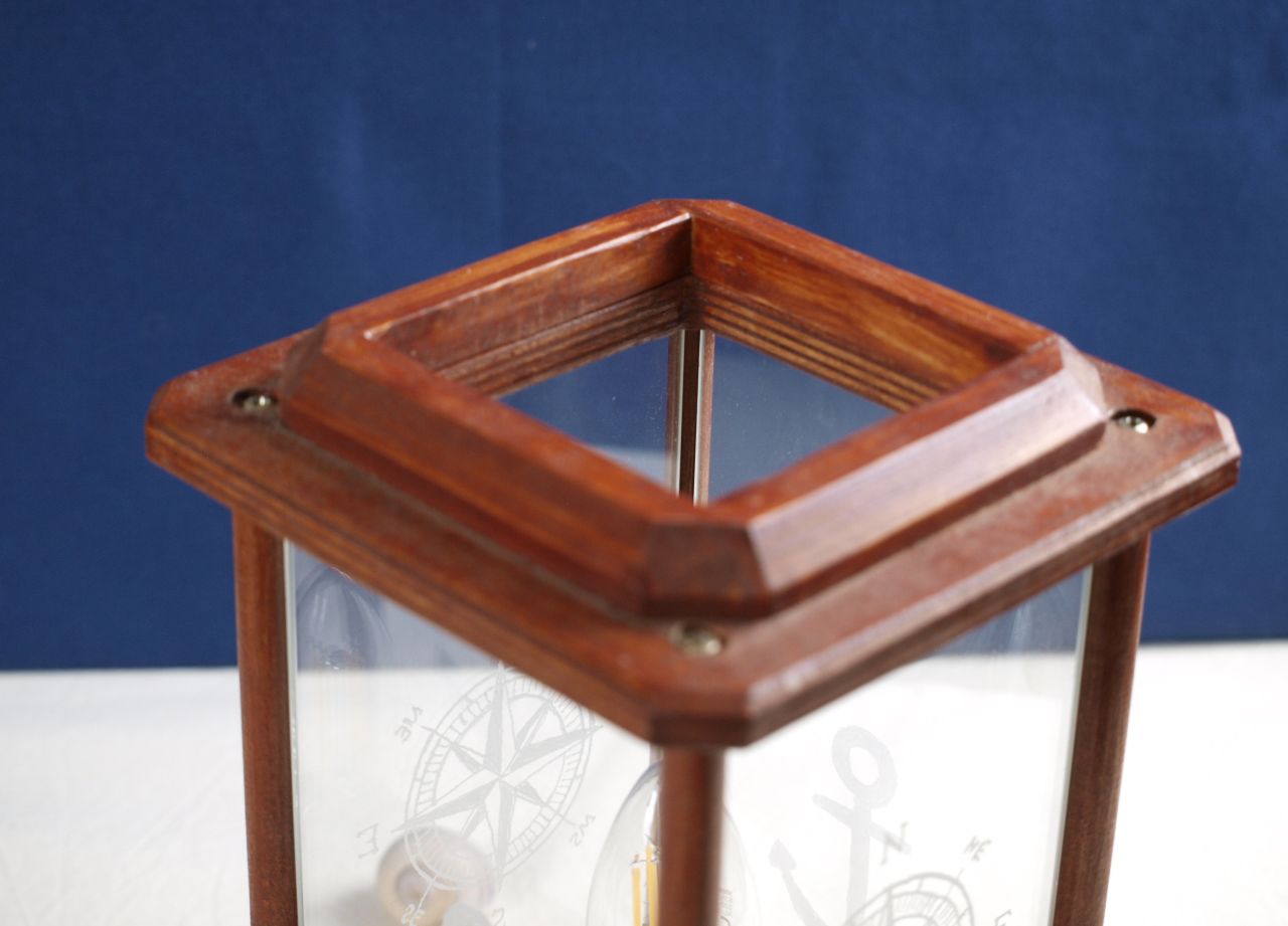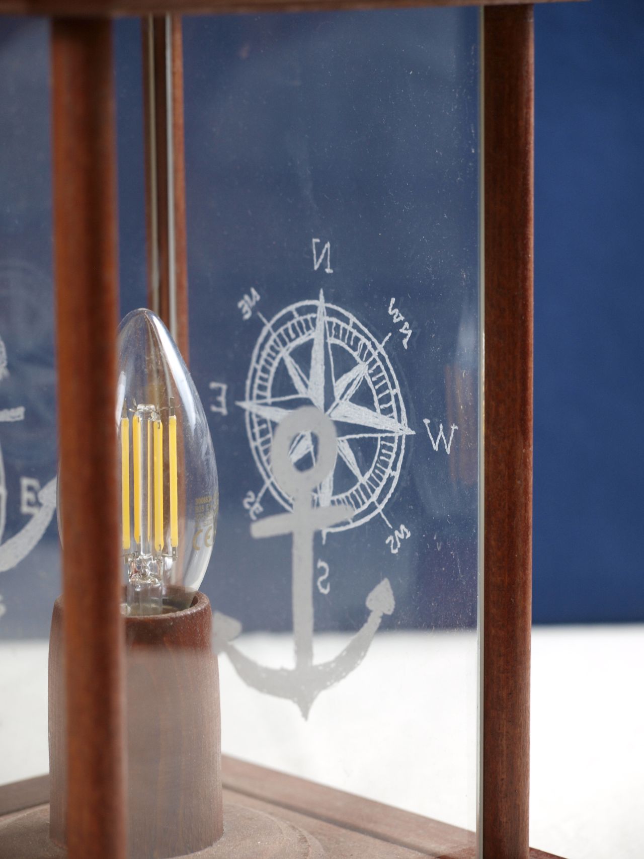 Dekolampe, elektrisch, magahoni mit maritimer Gravur Kompass & Anker