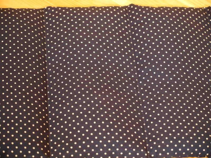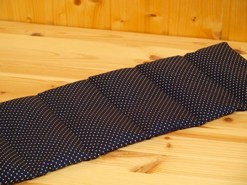 Das Kissen ist aus dunkelblauem Baumwollstoff mit weißen Punkten genäht und mit Roggenkörnern befüllt. Für eine gleichmäßige Verteilung der Körner sorgen die Kammern. Jede Kammer mit ca. 200g Roggenkörnern gefüllt.